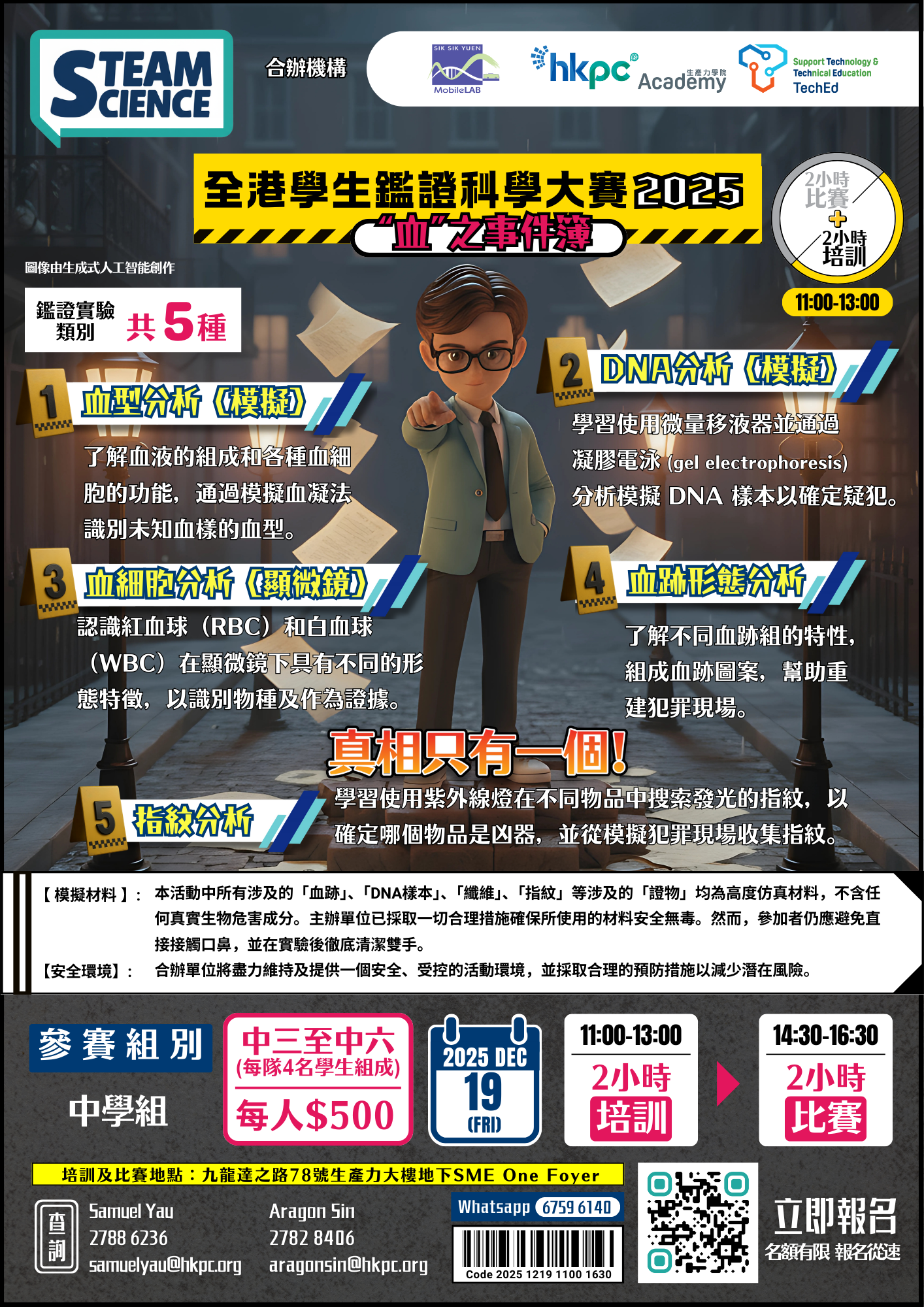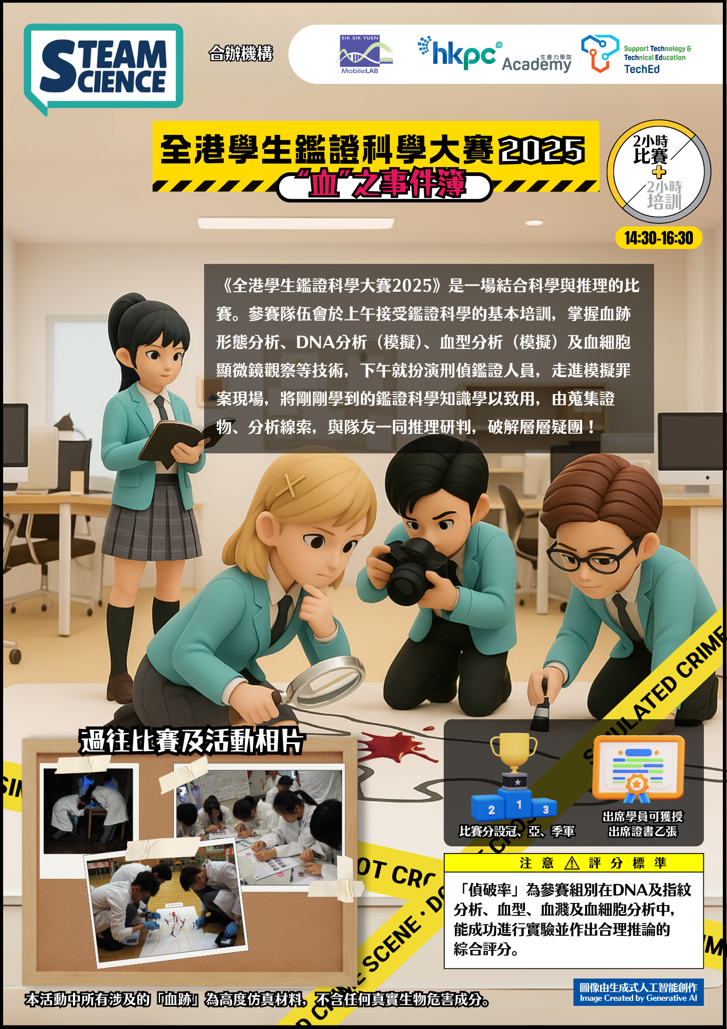 《全港學生鑑證科學大賽2025》是一場結合科學與推理的比賽。參賽隊伍會於上午接受鑑證科學的基本培訓,掌握血跡形態分析、DNA分析(模擬)、血型分析(模擬)及血細胞顯微鏡觀察等技術,下午就扮演刑偵鑑證人員,走進模擬罪案現場,將剛剛學到的鑑證科學知識學以致用,由蒐集證物、分析線索,與隊友一同推理研判,破解層層疑團!