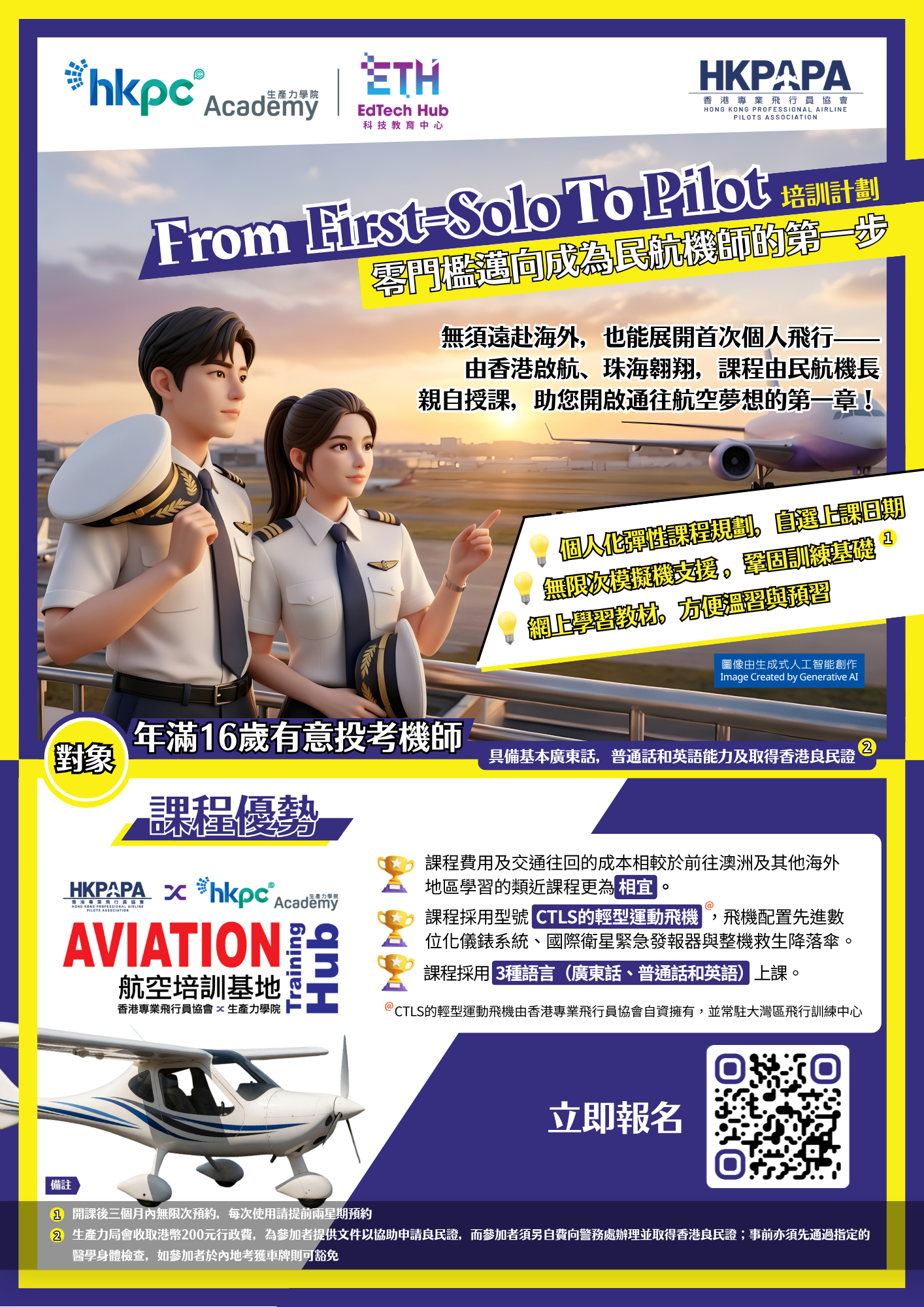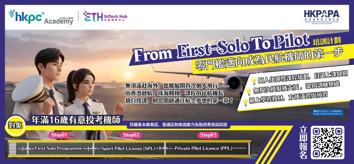 由香港專業飛行員協會及生產力學院聯合推出《From First-Solo To Pilot培訓計劃》,為 16 歲或以上立志成為民航機師的你,打造全方位的飛行理論及實踐飛行的培訓內容,為你塑造最實效的零門檻邁向成為民航機師起步點!