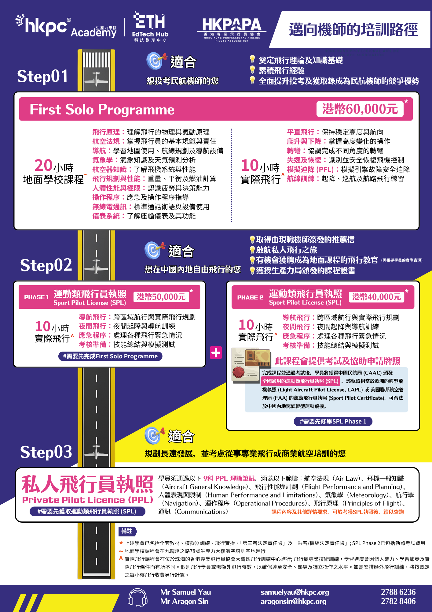 *上述學費已包括全套教材、模擬器訓練、飛行實操、「第三者法定責任險」及「乘客/機組法定責任險」; SPL Phase 2已包括執照考試費用 ; 地面學校課程會在九龍達之路78號生產力大樓航空培訓基地進行 ; 實際飛行課程會在位於珠海的香港專業飛行員協會大灣區飛行訓練中心進行; 飛行屬專業技術訓練,學習進度會因個人能力、學習節奏及實際飛行條件而有所不同。個別飛行學員或需額外飛行時數,以確保達至安全、熟練及獨立操作之水平。如需安排額外飛行訓練,將按既定之每小時飛行收費另行計算。
