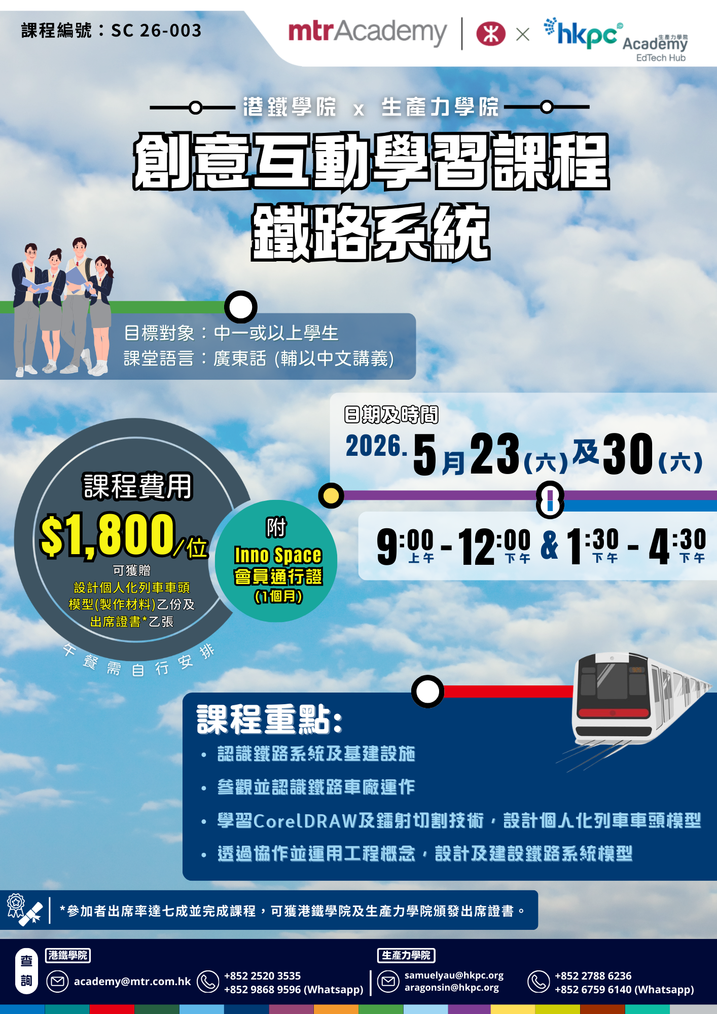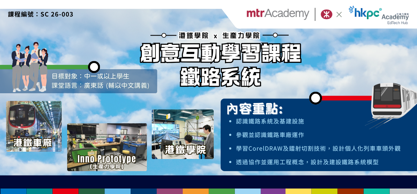 這個課程將帶你走入港鐵車廠,揭開鐵路系統的神秘面紗!不僅可以了解車廠的運作流程及認識鐵路系統和基建設施 🚉,還可以親手設計你心目中的列車車頭模型🎨,透過協作並運用工程概念,設計和建設鐵路系統模型🛠️。
