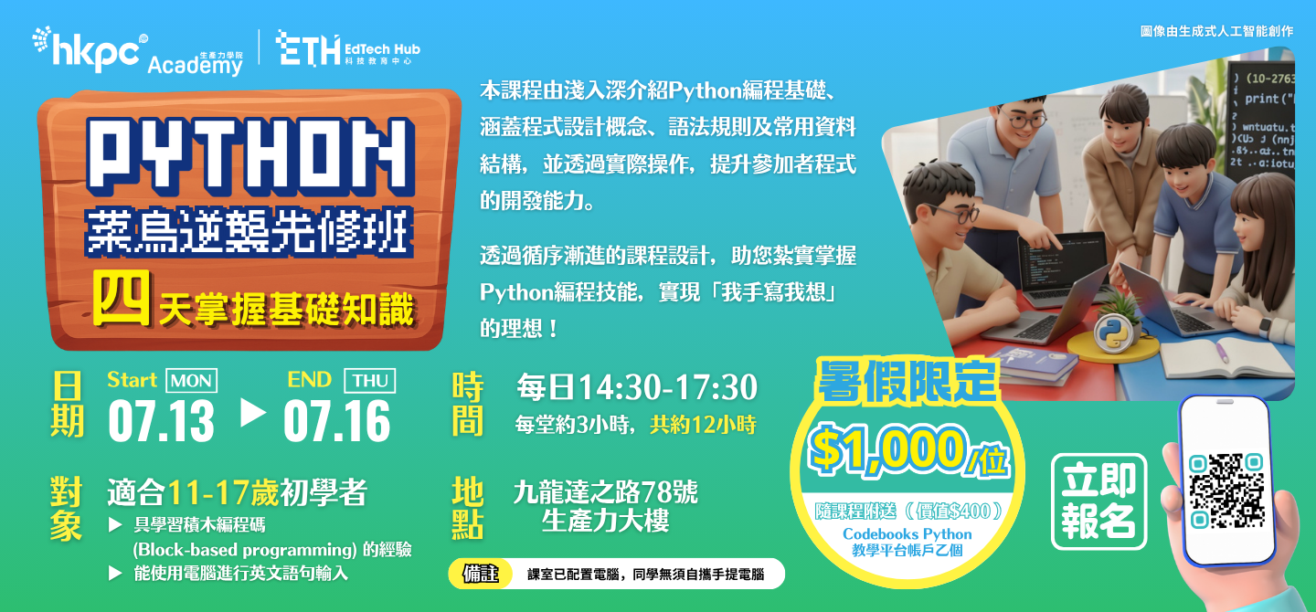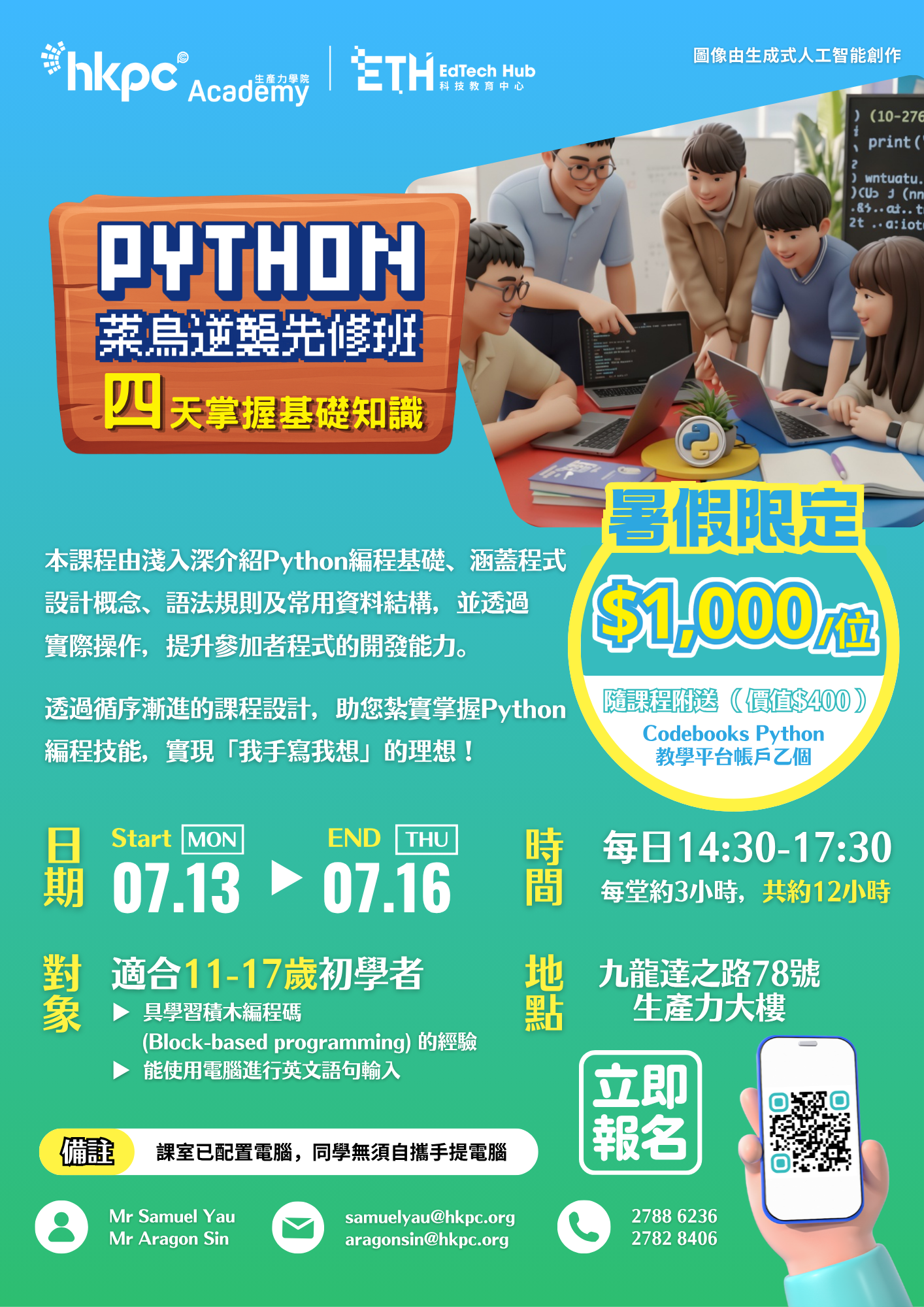 日期:2026年7月13至16日 (每堂約3小時 x 4日,共約12小時)