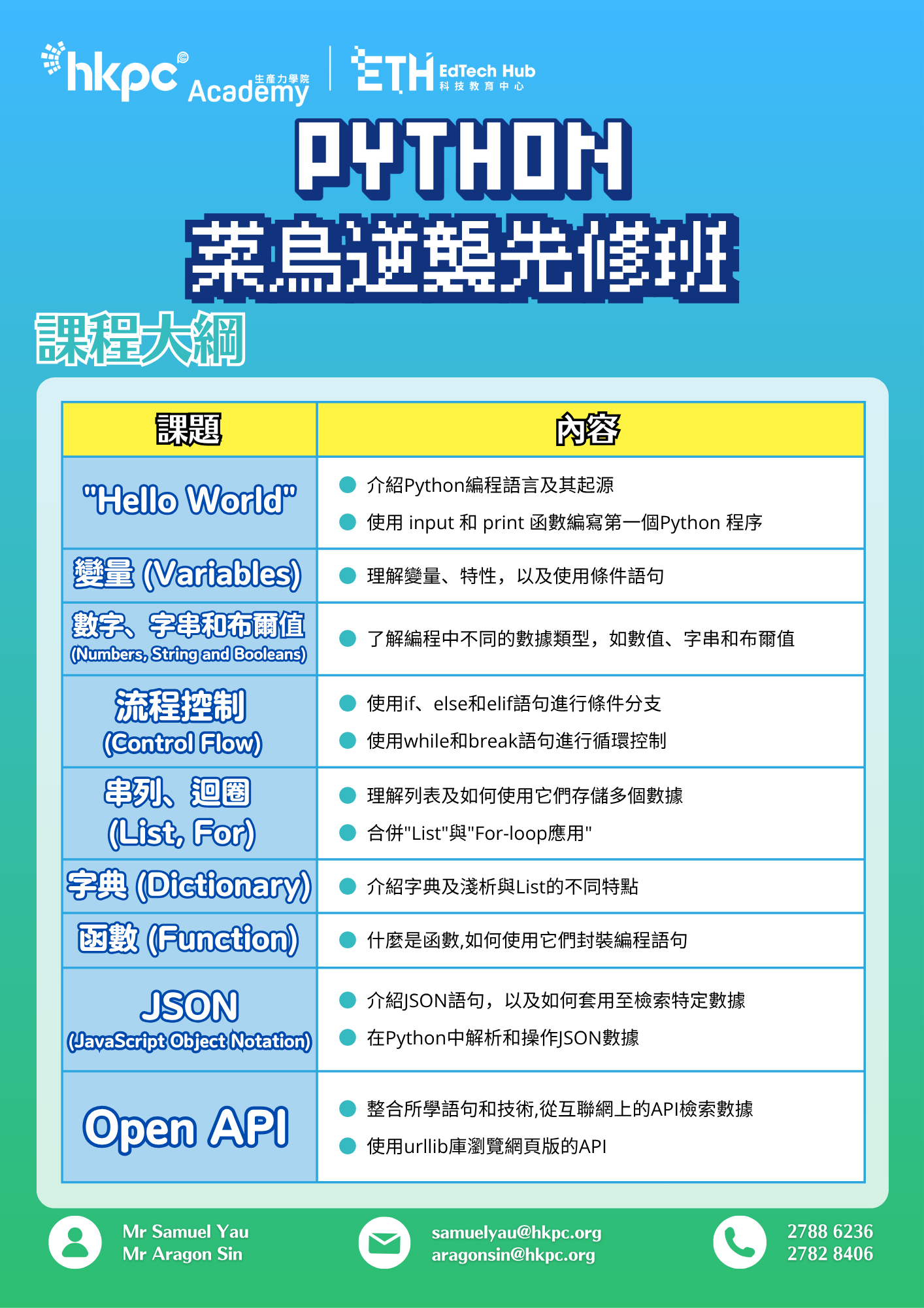 本課程由淺入深介紹Python編程基礎、涵蓋程式設計概念、語法規則及常用資料結構,並透過實際操作,提升參加者程式的開發能力。