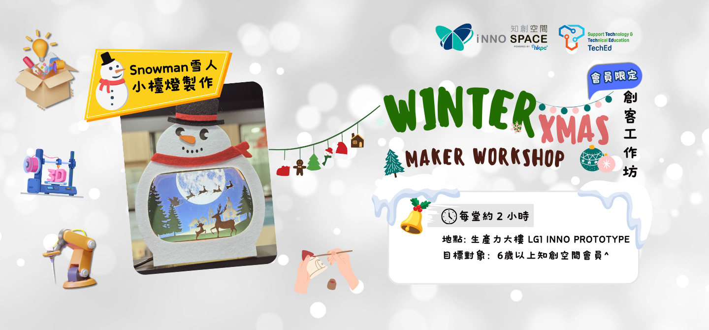 冬日來臨,不如到知創空間 Inno Space 動手製作屬於自己的冬日小檯燈!參加者將於工作坊中體驗激光切割與 3D 打印的應用,並親手打造獨特的雪人風格小檯燈,為冬日添上一份手作溫度。