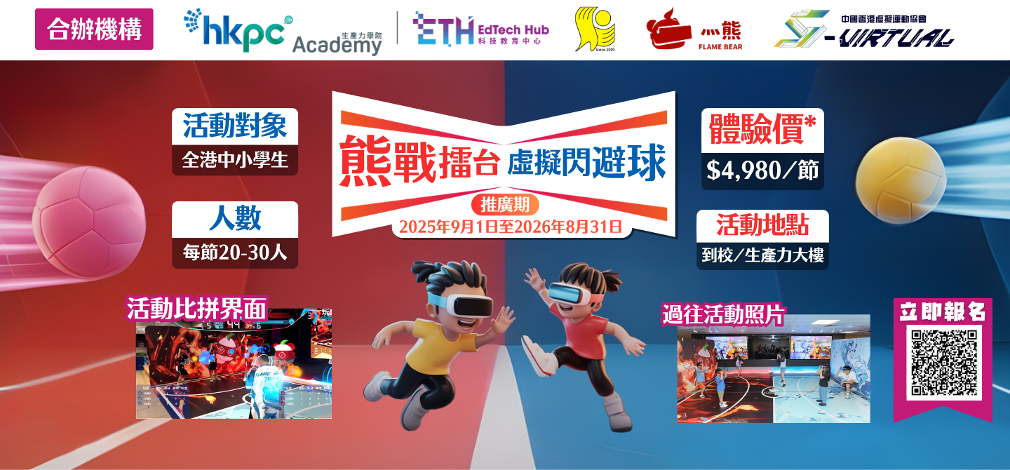 《熊戰擂台虛擬閃避球》正式推出!這是一項結合科技與體育的創新活動,將傳統閃避球的競技性與XR 技術結合,參與同學會進行2對2的激烈虛擬閃避球比拼,同學可以在虛擬與真實交織的情景下享受運動的樂趣!在2026年7月更會舉行學界賽,集結十八區的健兒同場比拼競技!同時會發掘有潛力的隊伍參加不同的跨地域比賽!
